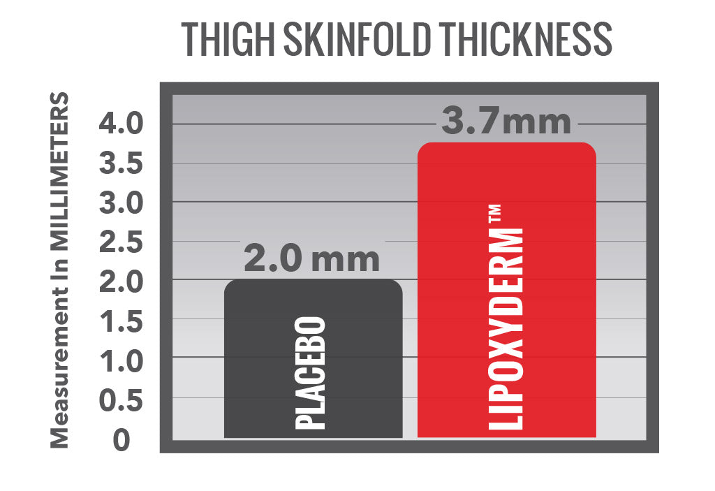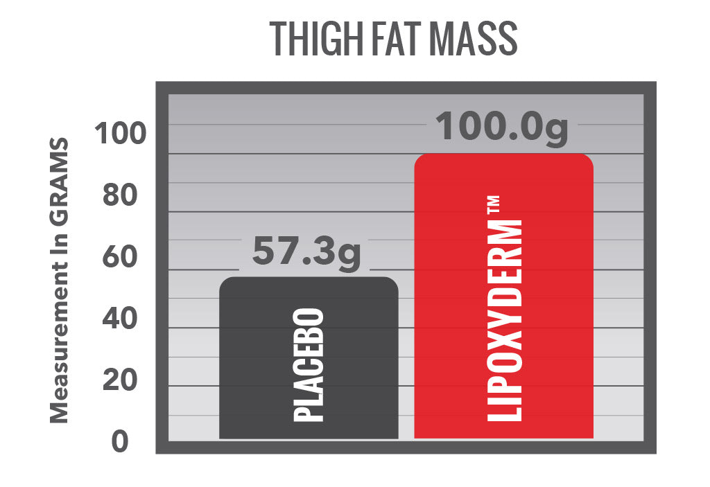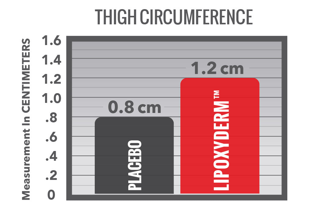 The conclusion of this study was that a twice-daily topical application of Lipoxyderm™ for 28 days compared to a placebo combined with a walking program and restricted caloric intake is more effective at reducing thigh circumference (1.2 vs 0.8 cm), thigh skinfold (3.7 vs 2.0 mm), and thigh fat mass (100.0 vs 57.3 g).